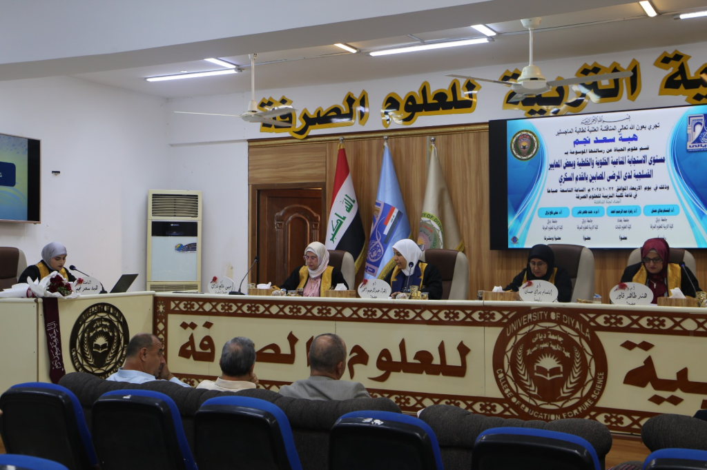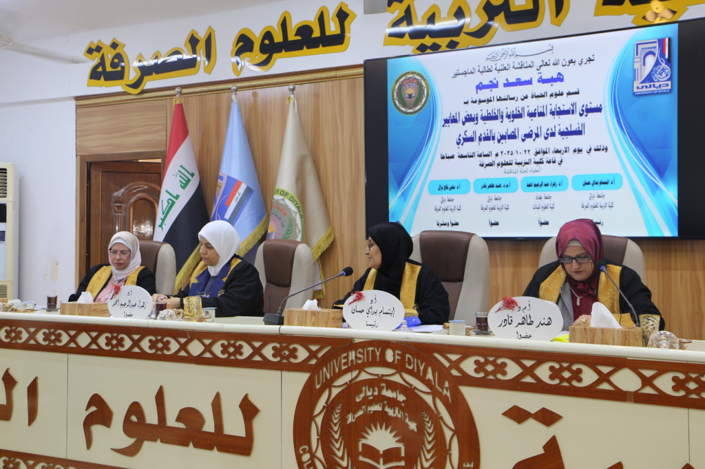 نوقشت في كلية التربية للعلوم الصرفة بجامعة ديالى رسالة الماجستير الموسومة ( مستوى الإستجابة المناعية الخلوية وبعض المعايير الفسلجية لدى المرضى المصابين بالقدم السكري )، وذلك على قاعة الندوات والمناقشات