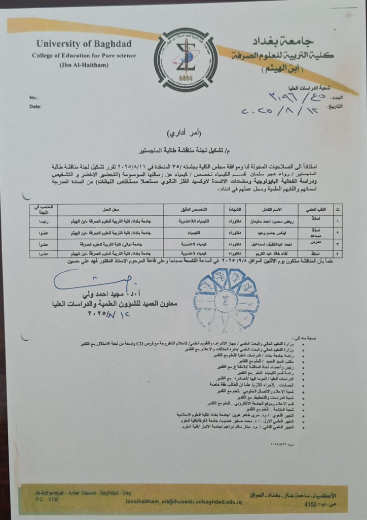 شارك المدرس الدكتور أحمد عبد اللطيف التدريسي في كلية التربية للعلوم الصرفة بجامعة ديالى، تخصص علوم الكيمياء بعضوية لجنة مناقشة رسالة ماجستير الموسومة ( التحضير الأخضر والتشخيص ودراسة الفعالية البيولوجية ومضادات الأكسدة لأوكسيد الفلز النانوي مستعملا مستخلص النباتات ) والتي تقدمت بها الطالبة رواء هجو سلمان ، في كلية التربية ابن الهيثم بجامعة بغداد.