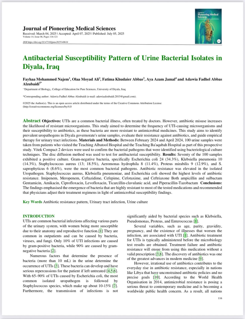 في مجلة Journal of Pioneering Medical Sciences الباكستانية، المصنفة ضمن مستوعبات Scopus بمرتبة Q3.