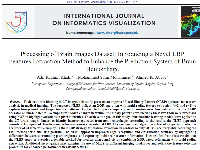 نشر فريق بحثي من قسم الحاسوب والذكاء الاصطناعي في كلية التربية للعلوم الصرفة بجامعة ديالى بحثًا علميًا متميزًا في مجلة عالمية رصينة، ضمن جهود الكلية في دعم البحث العلمي الرصين وتطبيق تقنيات الذكاء الاصطناعي في المجالات الطبية.