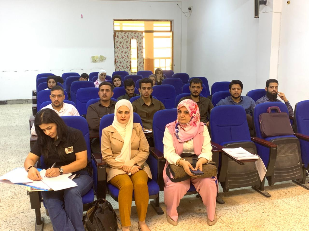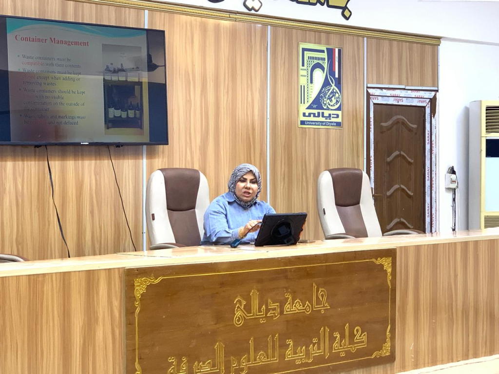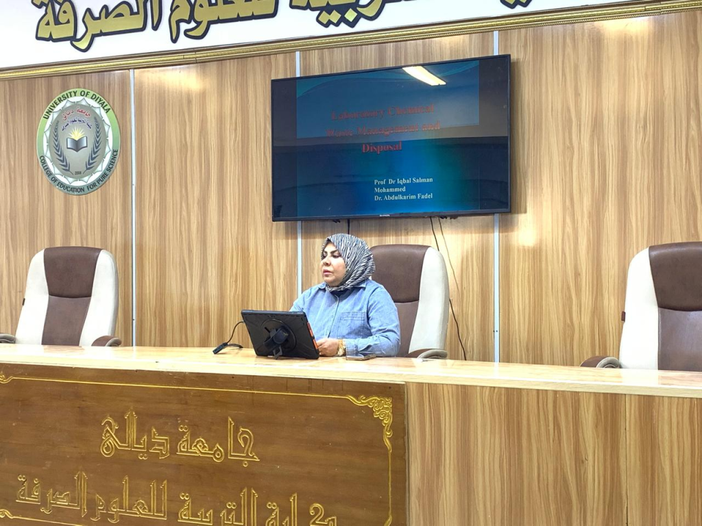 (إدارة التخلص من النفايات الكيميائية والمختبرية)، وذلك على قاعة الندوات والمناقشات في الكلية.