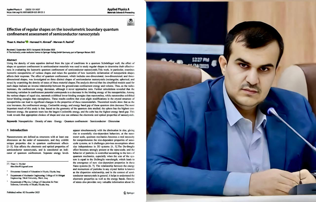 نشر التدريسي المدرس المساعد مروان رحمان رشيد من قسم الفيزياء في كلية التربية للعلوم الصرفة بجامعة ديالى بحثا علميا بعنوان (فعالية الأشكال المنتظمة في تقييم الاحتجاز الكمي الحدودي متساوي الحجم لبلورات النانو شبه الموصلة) التي تصدر من دار النشر الالمانية(Springer Nature) في مجلة (المانية) والداخلة ضمن مستوعبات سكوباس (Scopus) بمرتبة (Q2) و سايت سكور CiteScore(4.9)