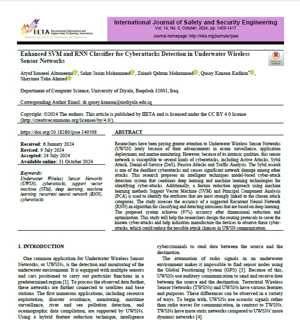 في مجلة ( International Journal of Safety and Security Engineering ) الصادرة عن دار النشر ( IIETA ) والداخلة ضمن مستوعبات سكوبس بمرتبة ( Q3)